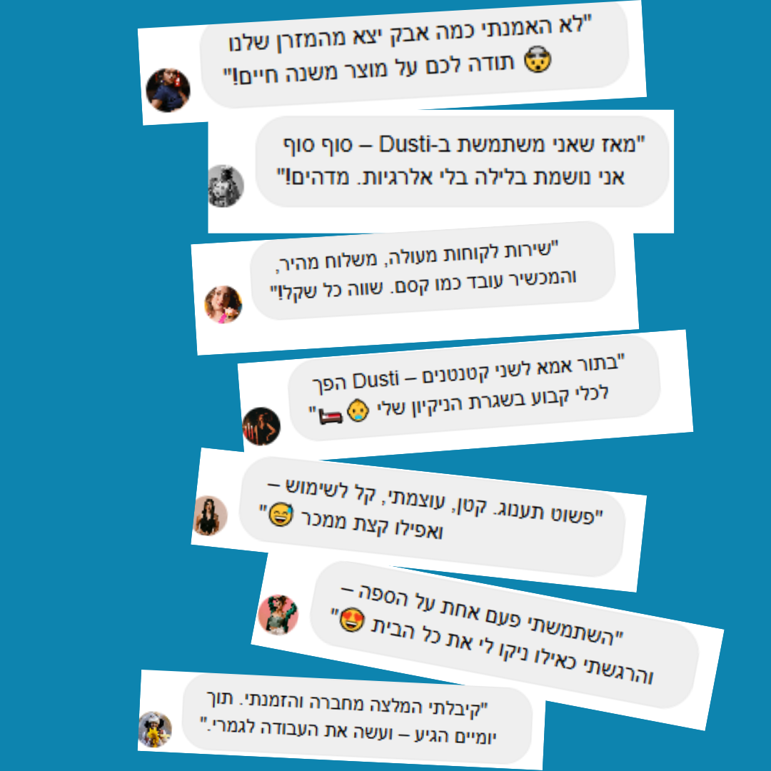 מאז שקנינו את DUSTI, הבית מרגיש אחרת. הילדים קמים בלי להתעטש, הריפודים באמת מרגישים נקיים – ואנחנו פשוט רגועים יותר. -